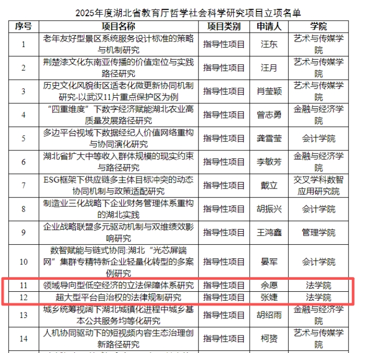 近日,2025年度湖北省教育厅哲学社会科学研究项目立项名单公示,法学院余愿老师申报的《领域导向型低空经济的立法保障体系研究》和张婕老师申报的《超大型平台自治权的法律规制研究》的课题获批指导性项目立项。