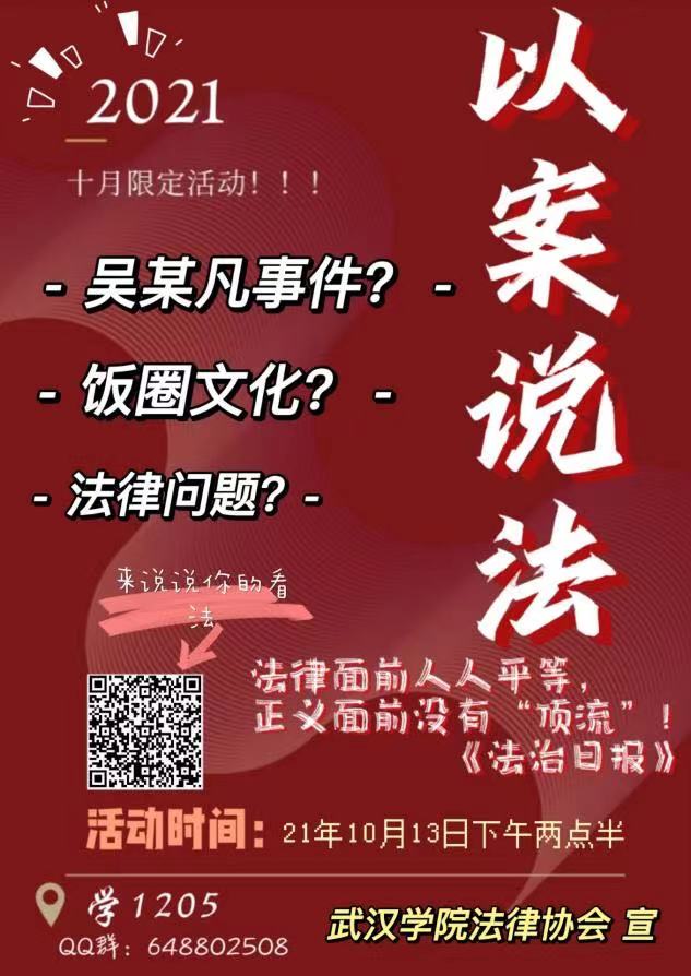 鉴于此,武汉学院法律协会将于10月13日下午两点半在学院楼1205举行“从吴某凡事件出发谈饭圈文化”的以案说法,欢迎大家来参加讨论!也希望各位能理智追星,做自己的superstar!