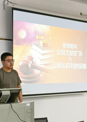 本次活动的主讲人1906班王清正首先介绍了活动背景,新冠疫情在全国乃至全球范围内爆发,各级政府积极响应配合,使得疫情防控工作取得阶段性成果,但在疫情防控管理中仍暴露出了一些问题。接着,王清正以一份汲冢镇返乡通告作为案例,引导同学们对“恶意返乡”“拘留”“紧急状态”等进行思考,进一步引出“公权力的扩张和公民私权利的保障”的主题。