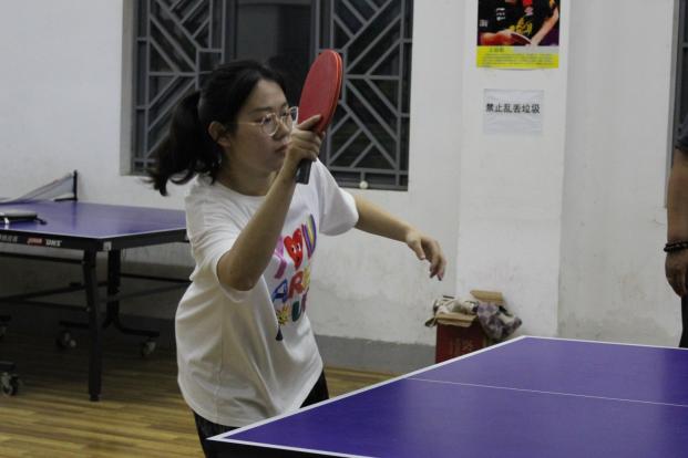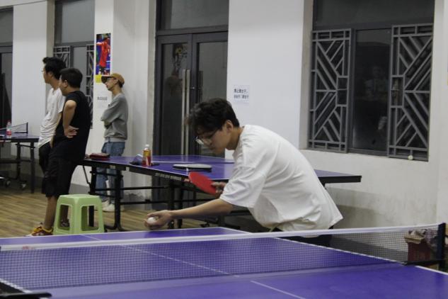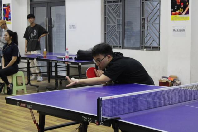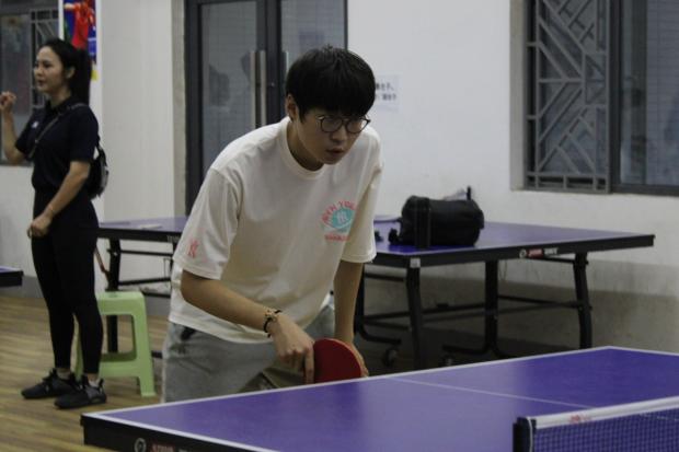 第二场,法学院代表队对阵外国语学院代表队,法学院派出乒乓球队队长刘朔男参战,双方队员你追我赶,目光紧盯着对方的动作,不敢有一丝的放松,最终刘朔男以11:5和11:4的好成绩取得第二场胜利。