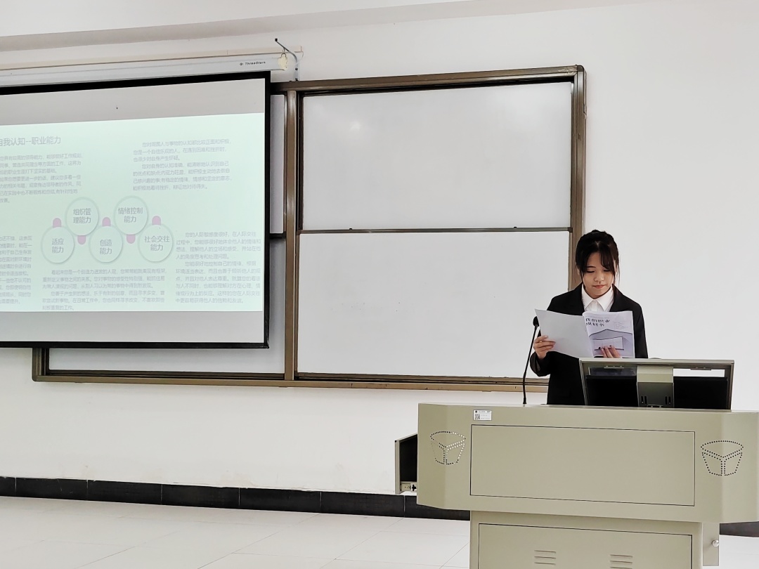 六号选手李婉璟在展示环节表现尤为突出,她在自我认识和外部环境两方面进行了全面的分析,并提出了自己的职业目标、发展路径和行动规划,还从可操作性和现实意义等方面进行了细致的阐述。在答辩环节也能准确得抓住重点,思路清晰地回答评委的提问,得到了评委的一致好评,充分体现出她扎实的专业知识和较强的综合能力。