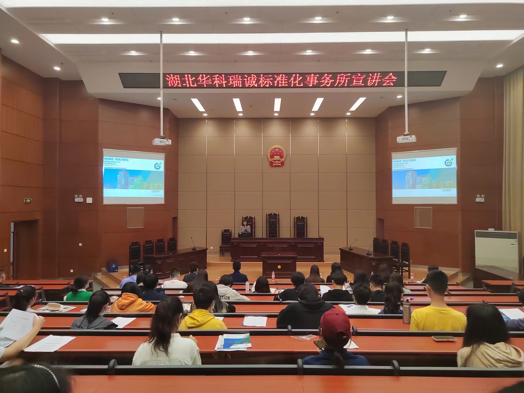 为进一步拓宽学生就业渠道,转变学生就业观念,加强学生对中国标准化行业和职业的了解,5月11日13:30,法学院标准化行业知识培训暨招聘宣讲会在中2301(模拟法庭)如期举行。湖北华科瑞诚标准化技术服务事务所(以下简称华科瑞诚)总经理李舒婷女士携工作人员前来为法学院学子进行宣讲,学院副院长周萍、党总支副书记常桥出席活动。