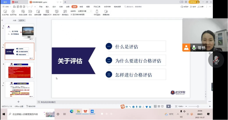 会上,常桥副书记从评估工作和座谈会安排两个方面向用人单位代表及校友代表讲解了相关注意事项。首先,她从什么是评估、为什么要进行评估和如何进行评估三个方面向参会代表解读了学校迎评促建工作的积极意义和深远影响,让用人单位和校友们能更清楚的了解到通过本科教学合格评估对于学校发展和提升人才培养质量之于社会和国家的意义。其次,她通过对网络视频座谈时间及平台选择、座谈会流程和内容、座谈中专家可能会问到的问题等方面的讲解,使用人单位和校友更加明确了对于参与座谈会的要做的相关准备工作。最后,常桥副书记对于参会代表提出的疑问一一解答,用人单位代表和校友代表们均表示会全力支持武汉学院的本科合格评估工作,也希望学校会发展的越来越好,能为国家培养更多的社会主义建设者和接班人。