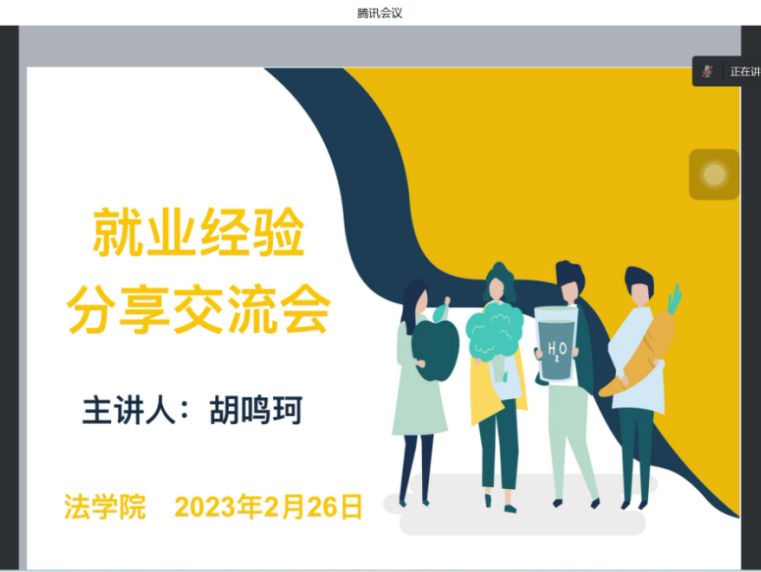 为帮助法学院2023届毕业生理清就业目标,明确就业方向,充分实现自身就业,2月26日晚18:00,法学院于线上举办了就业经验分享交流会。本次会议由毕业班辅导员王平波主持,特邀法学院校友19届毕业生胡鸣珂做就业经验分享。