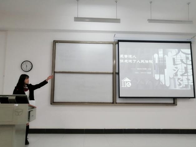 李婉璟同学以“自己虽然是普通人,但走进了人民法院”为主题,形象生动地分享了此次在人民法院实习的经历。在讲述印象最为深刻的案件之余,李婉璟同学真切地感受到了部分当事人法律观念的匮乏,重新审视了法学专业学习和实践的目标与价值。李婉璟同学说:“法院于我而言,是一般人很难靠近的地方,是最接近法律,感受到社会另一面的地方。法律宣传、普法教育的作用是让光明者始终光明温柔,让不自觉走向黑暗的人也有机会离开黑暗。”
