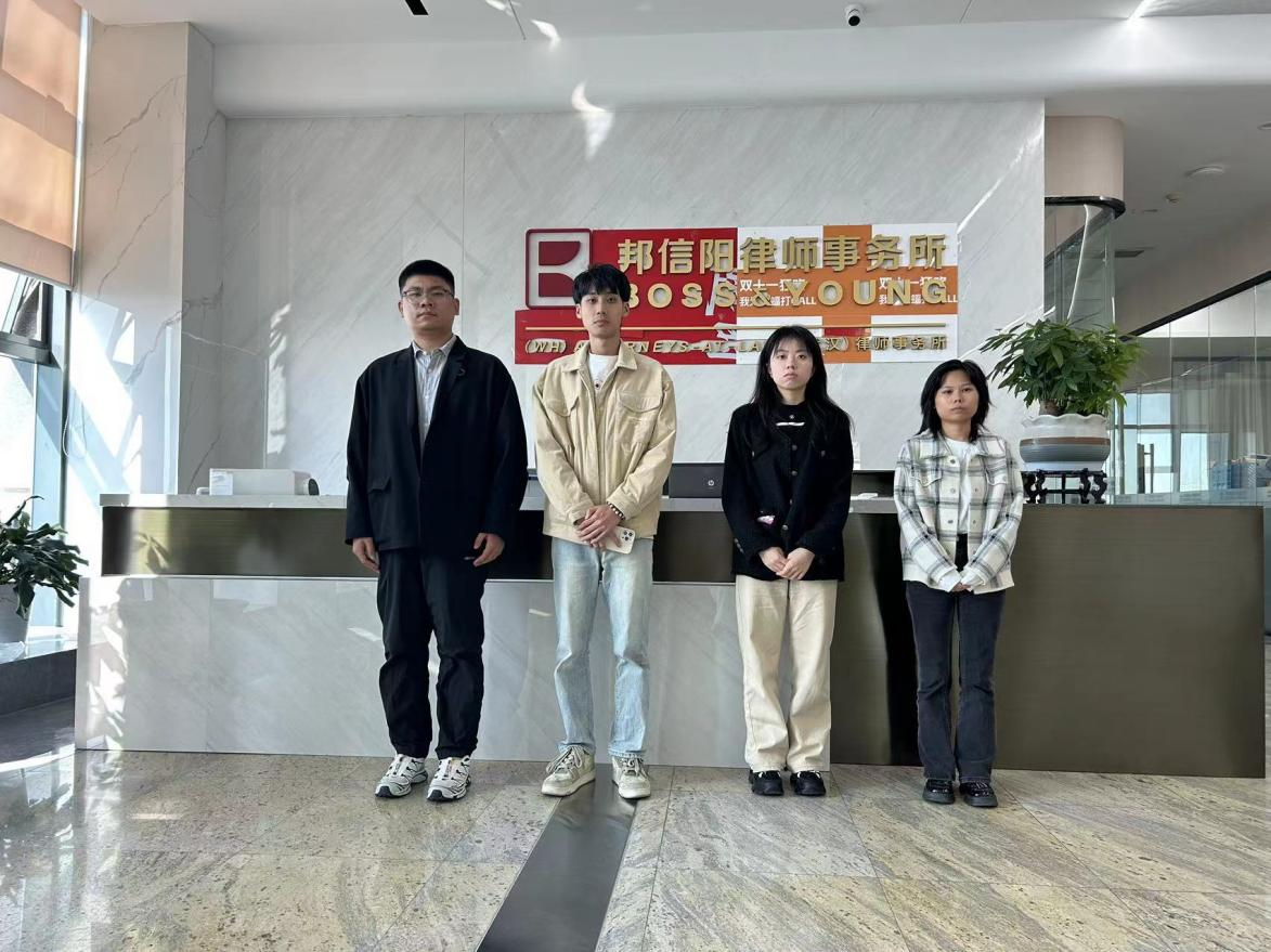 根据法学院毕业实习安排,2023年11月6日上午9点,在郑雪芹老师的带领下,法学20级的4名同学前往上海邦信阳(武汉)律师事务所开展为期两个月的毕业实习。