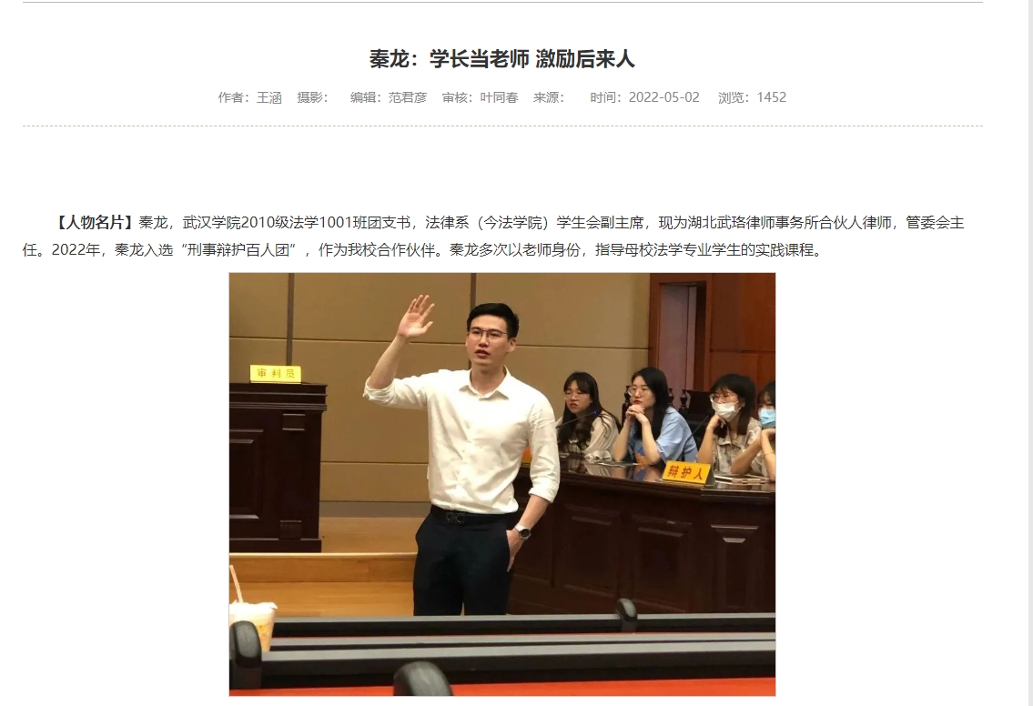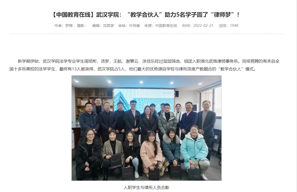 通过“教学合伙人”体制,相关协同育人基地也提前介入到人才培养环节,在课堂上提前培训了未来的员工,扩大了合作单位的知名度,提前储备了一批优质的员工。最典型的例子就是湖北武珞律师事务所,所里的多名律师担任我院的教学合伙人,学生通过和合伙人的联系毕业后会首选该律所作为就业单位,到今天为止,我院先后有9名优秀毕业生成功入职该所。