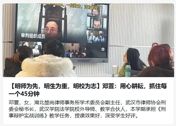 经过4年时间的探索与积累,“教学合伙人”模式的成果已初见端倪,学院目前与武汉市法律援助中心、湖北武珞律师事务所、智善传媒联合编写实践教学指导用书5本,充分应用于实践课堂的教学。
