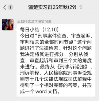 湖北瀛楚律师事务所对22名实习生实行系统化、精细化管理:将学生编入律师团队,实施打卡考勤与每日工作复盘制度,并发挥学生骨干带头作用。实习生可全面参与案卷整理、文书撰写、合同审查、案件跟进及庭审旁听等全流程实务,在真实案件中锤炼能力。