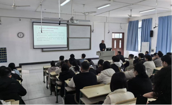 王广辉还结合法学专业核心特色,立足学院办学治院与师生成长发展实际,就全院深入开展树立和践行正确政绩观学习教育提出四点工作要求。一是坚守法治为民初心,筑牢以人民为中心的根本立场。全院师生要始终牢记法学专业崇法尚德、服务人民的初心使命,牢牢坚守以人民为中心的根本立场,将维护社会公平正义、保障人民群众合法权益作为永恒追求,把增进民生法治福祉、回应群众法治需求贯穿法学教学科研、理论学习、实务实践全过程。二是秉持求真务实作风,践行知行合一的实干精神。全院师生要坚决摒弃形式主义、官僚主义,始终坚持实事求是、知行合一的工作与治学态度。杜绝花架子、不做表面文章,以钉钉子精神抓实课堂教学、课题研究、实务实训等各项工作,把严谨的法治思维、务实的工作作风融入治院办学日常。三是树立长远战略思维,锚定可持续的学科发展目标。全院师生要树立全局视野与长远战略思维,立足自身岗位与学业规划,紧跟法治建设前沿趋势,统筹当下发展与长远规划,聚焦夯实学科根基、提升专业素养,为学院事业长远发展、法治中国建设积蓄持久动能。四是恪守依法依规准则,坚守崇法尚德的纪律底线。全院师生要带头尊法学法守法用法,严守校规校纪与法律法规,恪守学术道德,养成依法办事、依规行事的行为习惯,以实际行动捍卫法治尊严,涵养风清气正的育人环境与治学风气,彰显法学院师生的法治素养与责任担当。